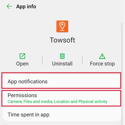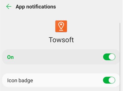 3- Make sure that notifications are not disabled at the application level. To do this, use the same path as specified above in the application settings, but instead of “Permissions”, tap “Notifications” and then make sure all notifications are enabled for TowSoft.