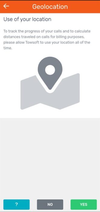Of course, to report changes in the status of your calls in TowSoft as well as your geographic position when you do so, the application needs to geolocate you.