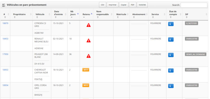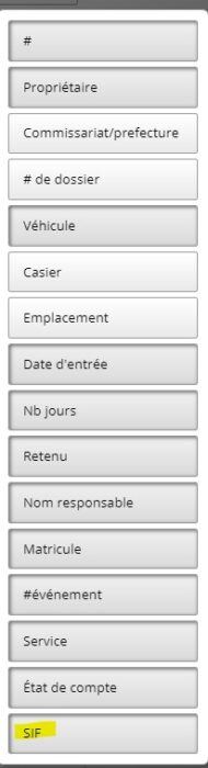 Lorsque vous accéderez à une de vos fourrières qui est connectée au SIF, vous pourrez configurer la visibilité des colonnes dans ce dernier afin qu’il affiche la dernière colonne « SIF », qui vous indique le statut des véhicules au SIF selon la dernière mise à jour que vous avez faite. Si vous ne faites pas cet ajustement, alors la colonne ne sera pas affichée par défaut.