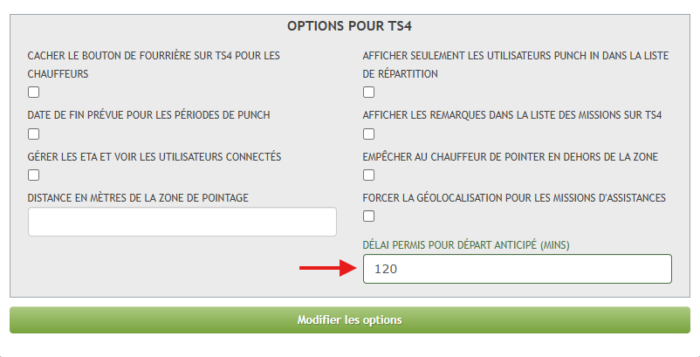 Il est aussi possible de changer le délai permis pour un départ anticipé pour les chauffeurs. Habituellement, les chauffeurs ne peuvent pas commencer la mission avant l’heure prévue.